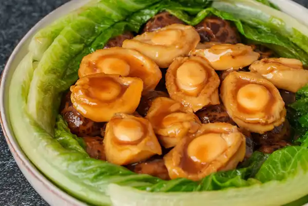 Abalone is called 鮑魚 baau1jyu4 in Cantonese, and the two characters sound like the words for satisfied and having surplus. Then, lettuce, which is called 生菜 saang1 coi3 in Cantonese, sounds like growing wealth. You can see why this is a popular dish to serve for New Year's and other celebrations!