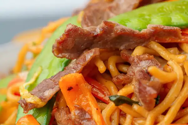 Stir-fry with the beef for 30-40 seconds, then add the sweet peppers, snow peas, and green onion greens. Stir-fry for another 40-50 seconds and give it a taste. We added more light soy sauce (0.50 tbsp), but as always, adjust to your preference.