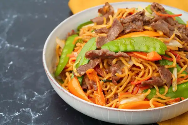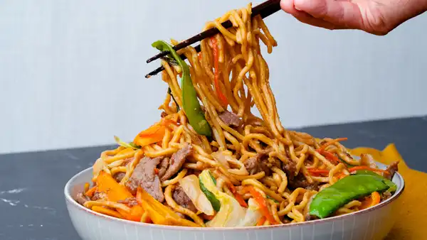 Give the stir-fry sauce a quick stir to recombine anything that might have settles, then pour it into the wok. Follow with the pre-cooked beef, and mix everything together. Let the noodles soak up the sauce.