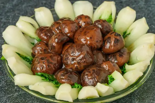 To make a beautiful wreath, use a circular dish. Place each bok choy so the stems face out and the leaves turn into the center. Later, you'll plate the mushrooms over the leaves so they can soak up all the delicious sauce.