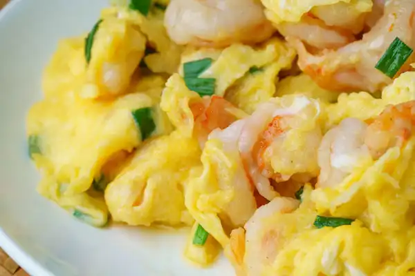 In contrast, you're not going to want any milk or water in these eggs, and you're very quickly cooking layers of eggs on super high heat, resulting in a chewier outside and a silky, tender inside, mixed with bites of juicy-but-not-waterlogged shrimp.