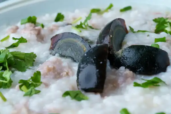 Traditionally, century eggs are chicken or duck eggs preserved in a mixture of clay, salt, lime, and rice hulls. Over time, mass production has modified the preservation method with different or simplified ingredients, and cut down the curing time to months, or even weeks. The result of preserving eggs in this unique, alkaline mixture is a jelly-like black-brown egg white, and a dark green egg yolk.