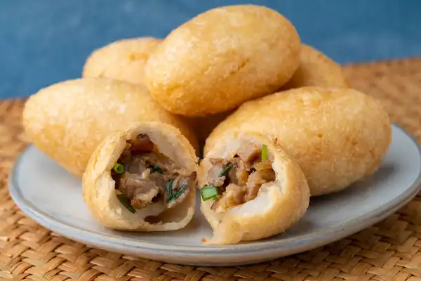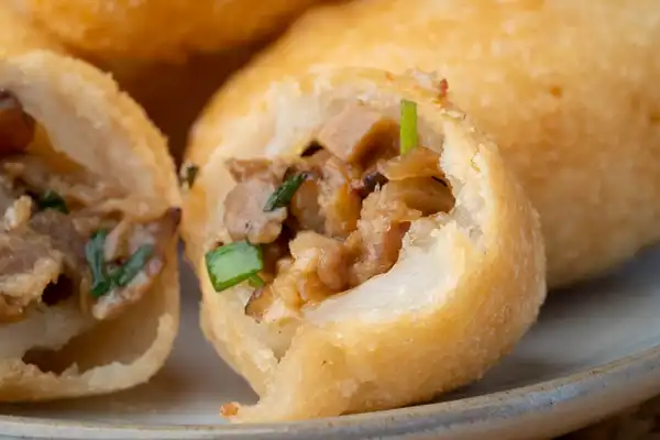 Crispy, chewy, and juicy, all at once? Yes, it's possible, because we pre-cook the luscious filling, use glutinous rice flour for the wrapper to get that chewiness, and finally deep-fry for that delicate crunch.