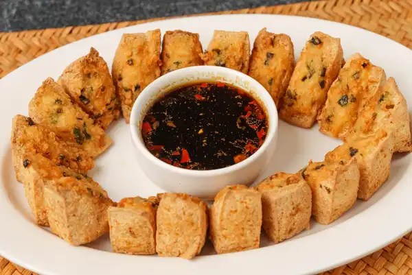 My dad actually grew up buying these from street vendors; they'd go door to door, and once you decided to purchase some delicious fried stuffed tofu, the vendor would fry it right then and there, at your door.