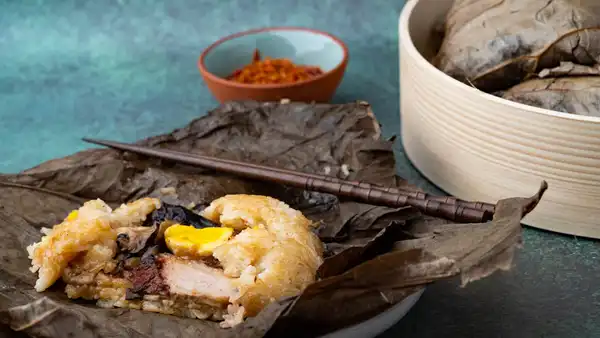 Originally, street vendors used to steam this with a bowl, and then introduced lotus leaves as a more convenient to-go option. Not to be confused by joong/zongzi, which traditionally uses bamboo leaves and a variety of other fillings, lo mai gai is characterized by its use of glutinous rice and chicken steamed in lotus leaves.