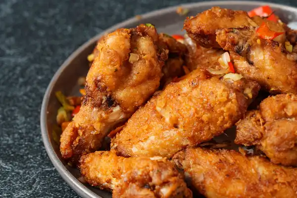 In your deep-frying vessel (a deep pot is best, in our opinion), heat up oil (5 cup) to 300°F. There should be enough to cover the chicken wings.