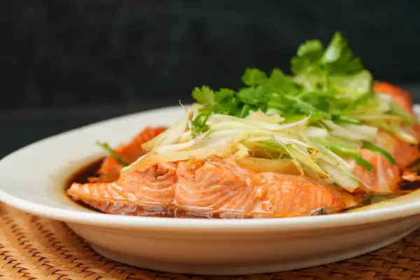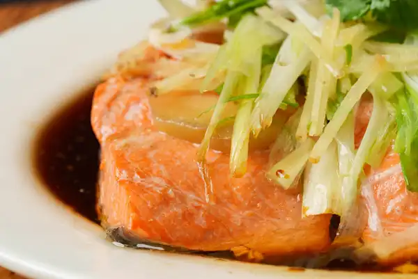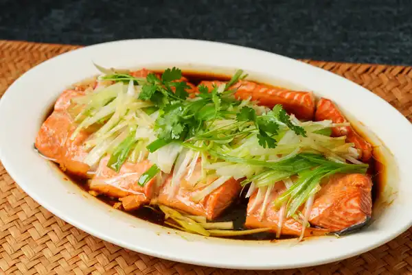 Steamed salmon is great with a bowl of rice. To complete the meal, add a vegetables, such as our Stir-Fried Bok Choy, Choy Sum with Garlic or Chinese Broccoli with Oyster Sauce.