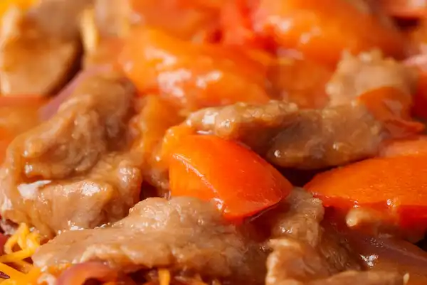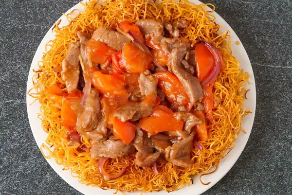Ladle the tomato and beef sauce right over your dish of crispy pan-fried noodles. Serve and eat immediately for maximum crunch. Enjoy!